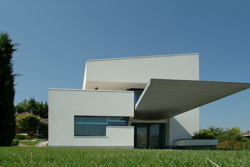 Il terreno pianeggiante ai piedi di una collina ospita il nuovo edificio unifamiliare, esteso secondo l’asse nord-sud, il maggiore del lotto. Il volume è animato in tutta la sua lunghezza da una vera e propria spina dorsale a cui fanno riferimento piccoli “grappoli abitativi” estensibili e collegabili tra loro mediante aperture mobili scorrevoli, che, all’esigenza, rendono gli spazi diversamente fruibili per funzioni e dimensioni, parti e tutto dell’insieme.